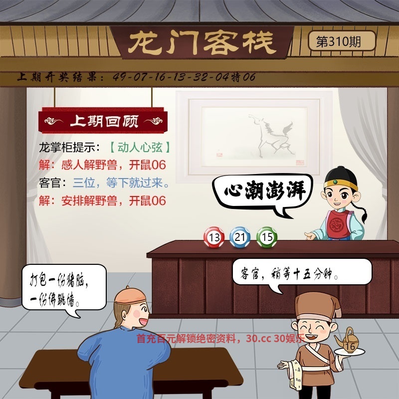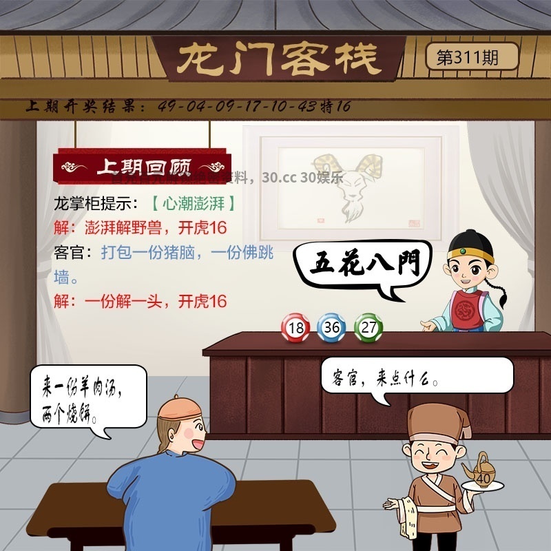 311期:龙门客栈解析 掌柜:五花八门 小二:客官,来点什么 客官:来一份羊肉汤,两个烧饼 解:五花八门。解蛇猪猴狗鼠牛 推荐特肖:蛇猪猴狗鼠牛 |
